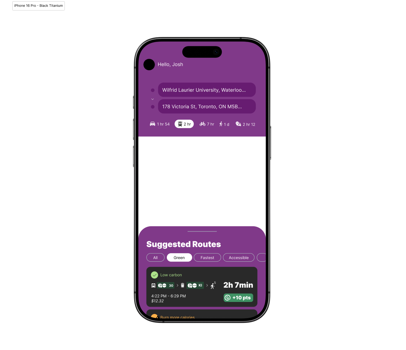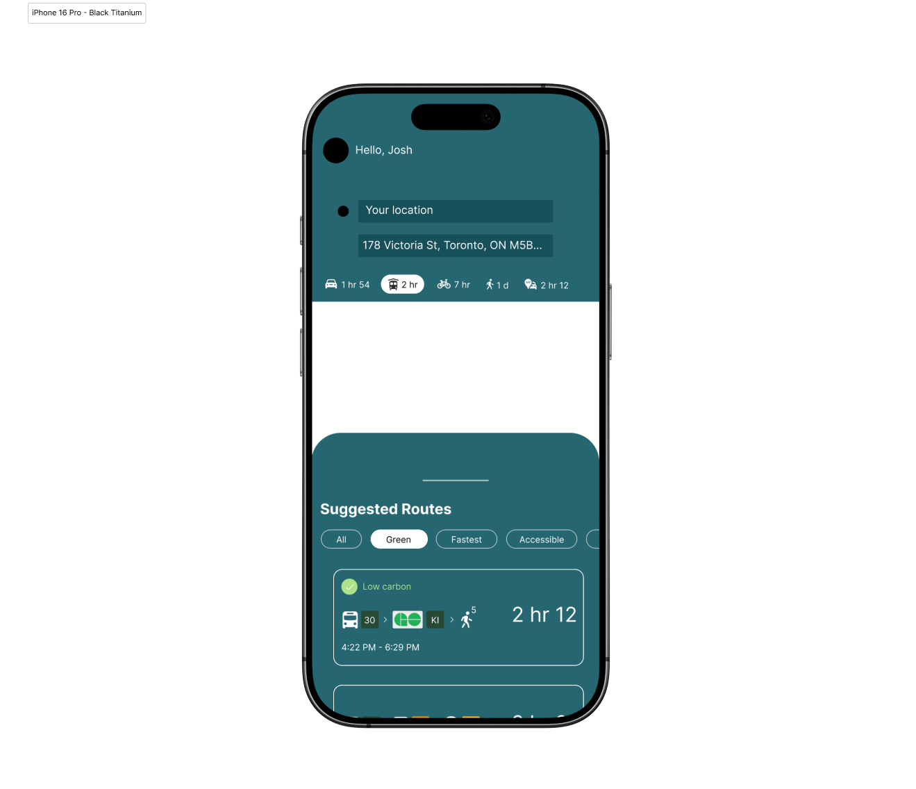 We introduced clearer iconography, accessibility toggles, carbon-saving visuals, and an eco-points reward system. The final design below creates an experience that supported users to make greener commuting choices every day.