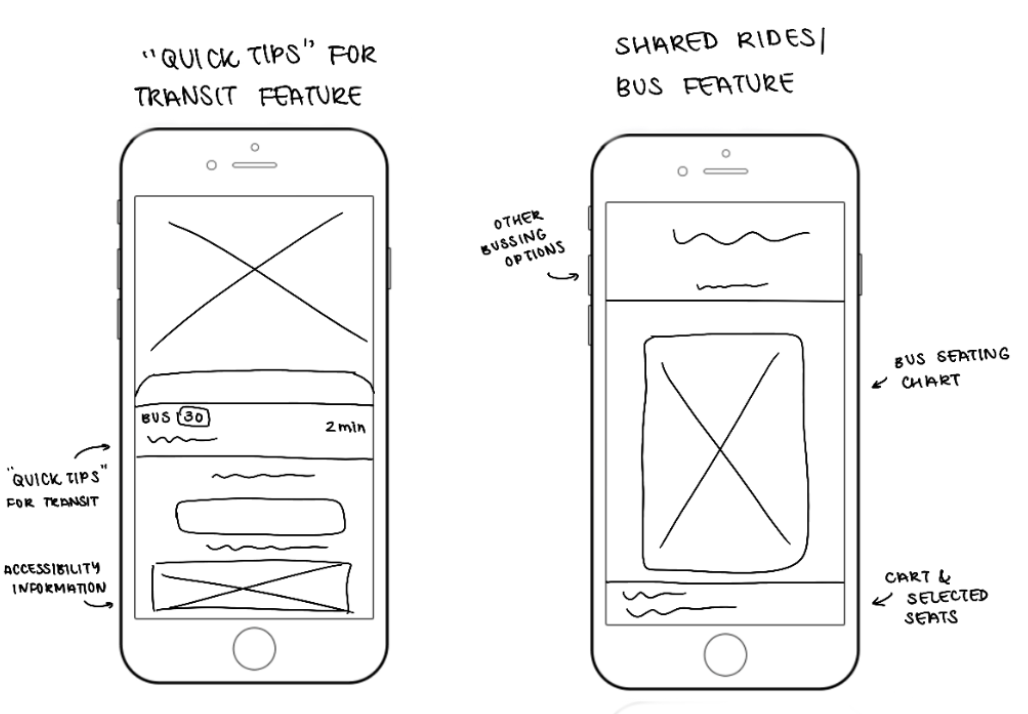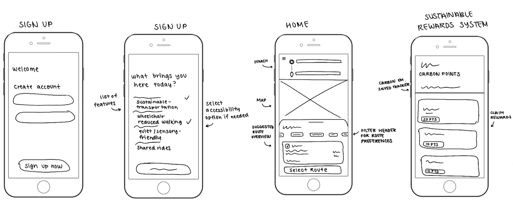 The first wireframes focused on key actions like transportation preferences, route planning, rewards system, and accessibility filters.